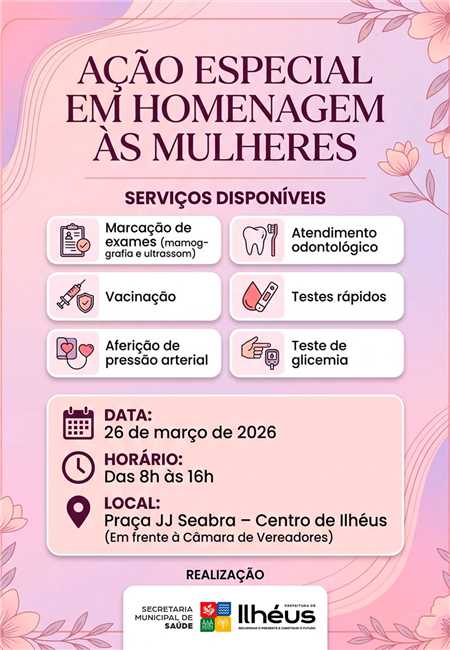 A Prefeitura de Ilhéus, por meio da Secretaria Municipal de Saúde, promove dia 26 de março uma grande Ação da Mulher, com oferta de diversos serviços gratuitos de saúde voltados ao público feminino. A iniciativa acontece na Praça JJ Seabra, no centro da cidade, em frente à Câmara de Vereadores, como parte do encerramento das atividades alusivas ao mês da mulher.